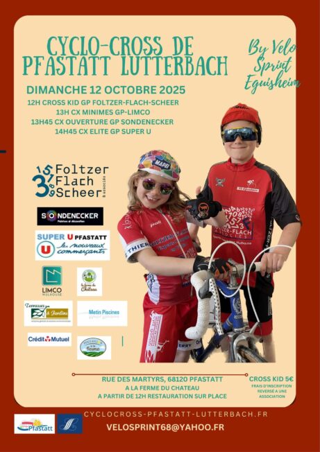 Le dimanche 12 octobre 2025 à partir de 11h45, le Cyclocross de Pfastatt-Lutterbach accueille le Cross Kid avec des jeunes sportifs de 3 à 12 ans dans une course d'initiation. Les sportifs auront le plaisir de faire la course dans un cadre magnifique réhabilité par la société Rothberger - La Ferme du Château.